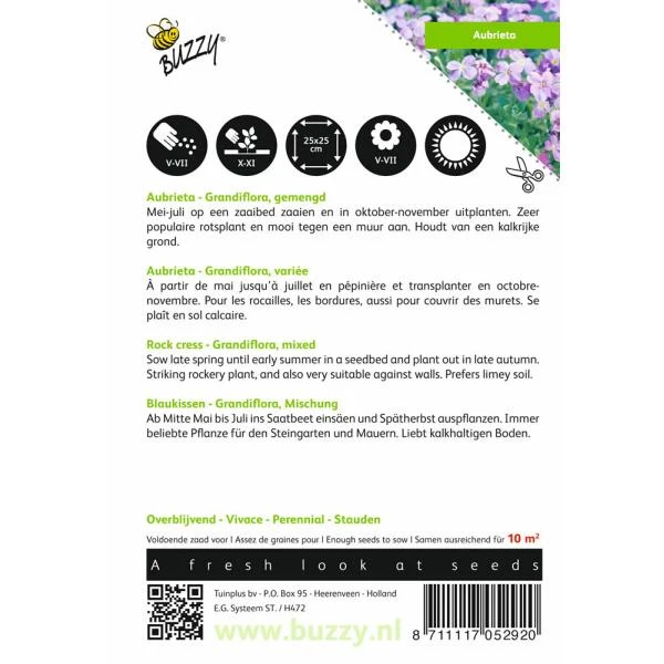 Aubrieta geeft laagblijvende, kussenvormende plantjes in de kleurschakering van violette, blauwe, roze en rode tinten. De kleurrijke Aubretia’s zijn heel mooi toe te passen tussen stenen en tegels, hangend over muurtjes en zelfs in plantenbakken.
