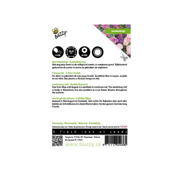 Deze tweejarige klokjesbloemen bloeien rijk met tot 5 cm grote klokjes. Het zijn zeer dankbare zomerbloeiers en prima snijbloemen. De enkele bloemen van dit mengsel vertonen purperen, lila, roze en crème-witte tinten.