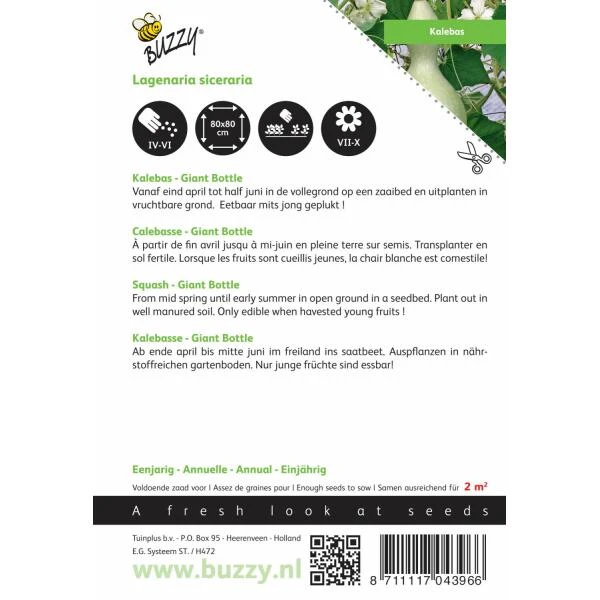 Kalebas Bottle gourd is een groene flesvormige kalebas die zich perfect leent als sierpompoen maar je kan er ook originele vogelhuisjes of zelfs een drinkfles/karaf van maken. Je kan ze beschilderen en er op die manier jouw eigen kunstwerk van maken. Pluk je ze in een jong stadium dan zijn ze ook eetbaar!