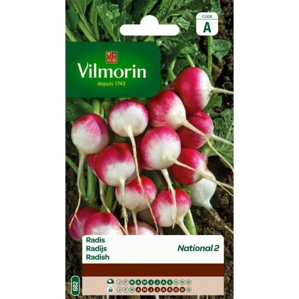Deze traditionele variëteit Radijs National 2 wordt niet pikant, behoudt heel lang haar goede kwaliteiten en vormt ronde rode radijsjes met een witte voet. Radijsjes bevatten vitamines (B en C) en mineralen (calcium, kalium, magnesium en ijzer).