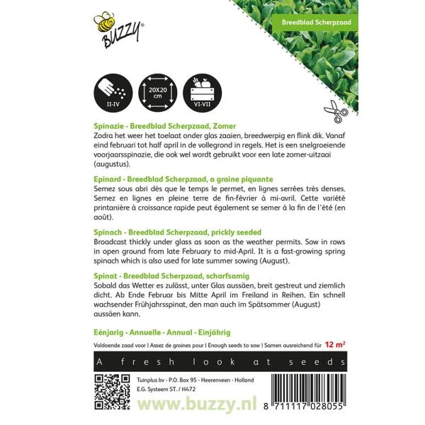 Spinazie Breedblad Scherpzaad is een snelgroeiend ras met malse bladeren, lekker gestoofd of rauw. Kan zowel voor voorjaars- als voor herfstteelt gebruikt worden.