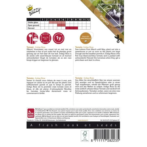 De tomaten van Indigo Rose bevatten zeer veel antioxidanten die van nature ook voorkomen in bosbessen. De vruchten worden 70 tot 80 gram en hebben een uitzonderlijk lekkere smaak. De schil is diep donkerpaars tot paarsbruin van kleur.