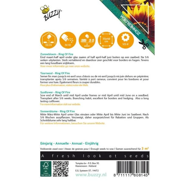 Zonnebloem Ring of Fire, sterk vertakkend en daardoor zeer geschikt voor borders en hagen. Tevens een lang houdbare snijbloem.
